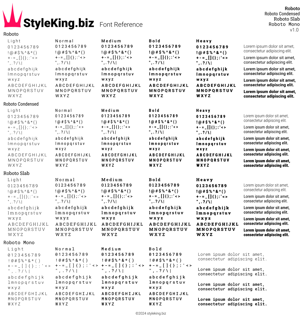This is a font reference for the Roboto font, to serve as a visual aid when choosing fonts and font weights.